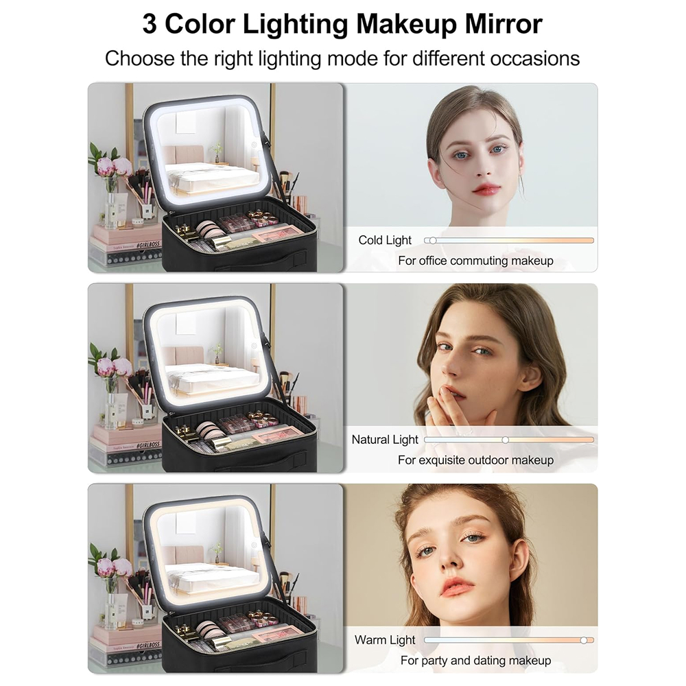 Designed for the beauty lover on the go, this versatile makeup organizer combines functionality with style. Featuring a built-in mirror with three adjustable brightness settings, it ensures you can apply your makeup with precision, no matter where you are. The spacious, waterproof design offers ample storage for all your essential cosmetics and tools, keeping everything neat, tidy, and easily accessible.